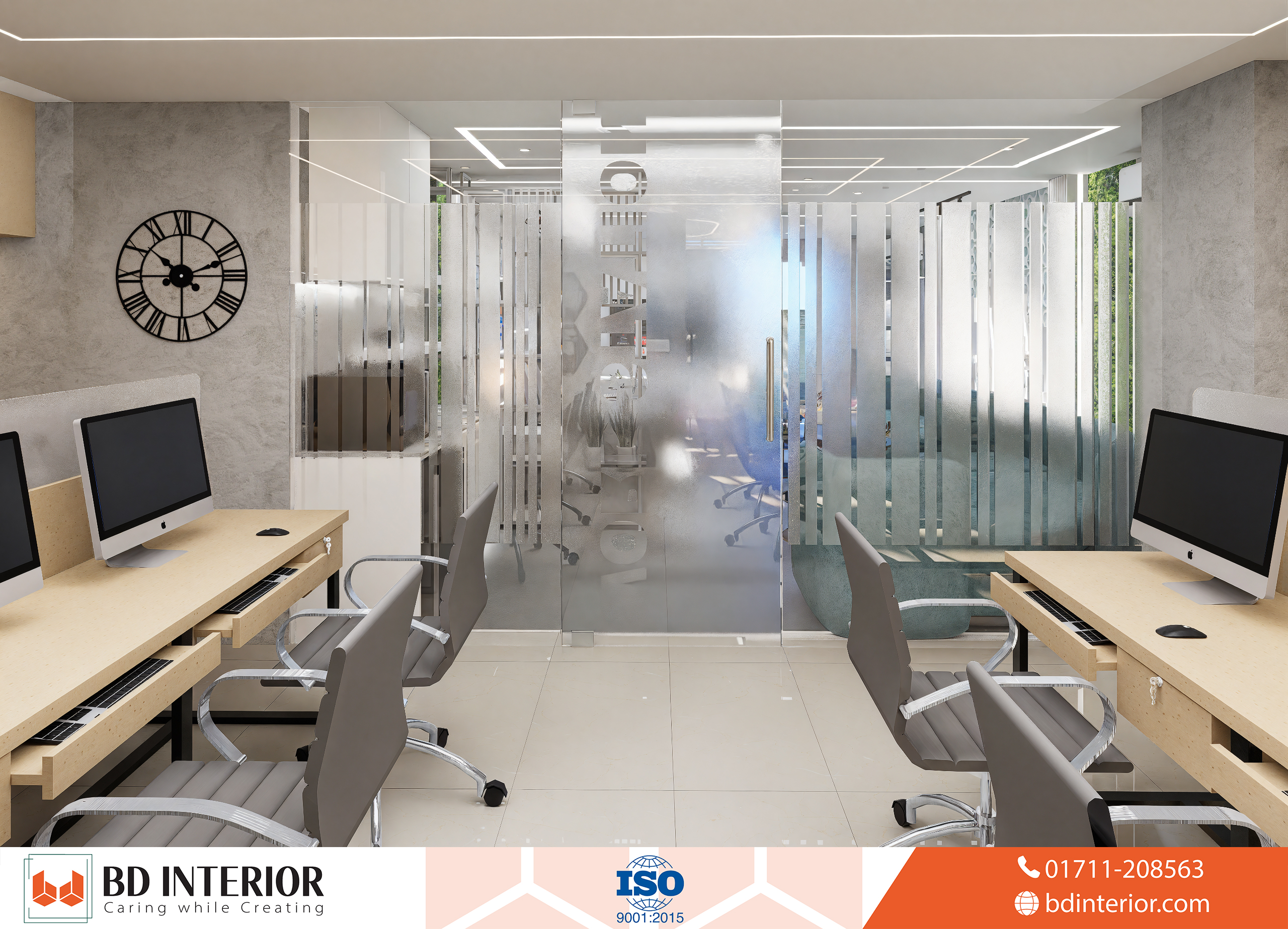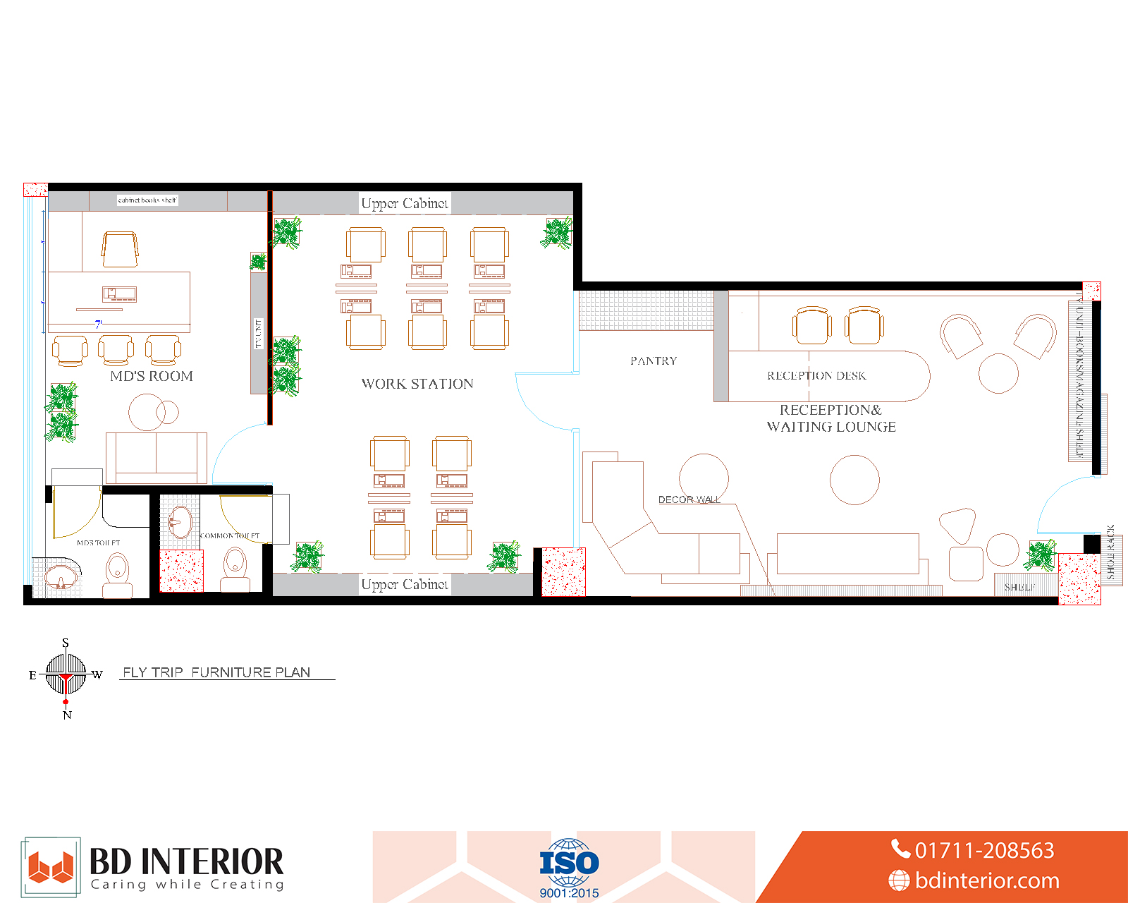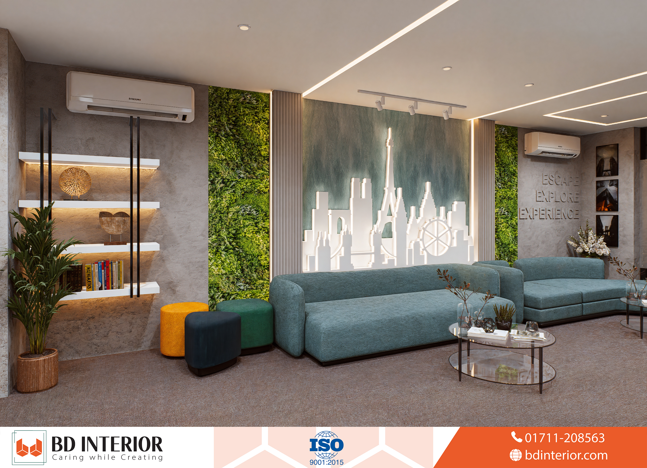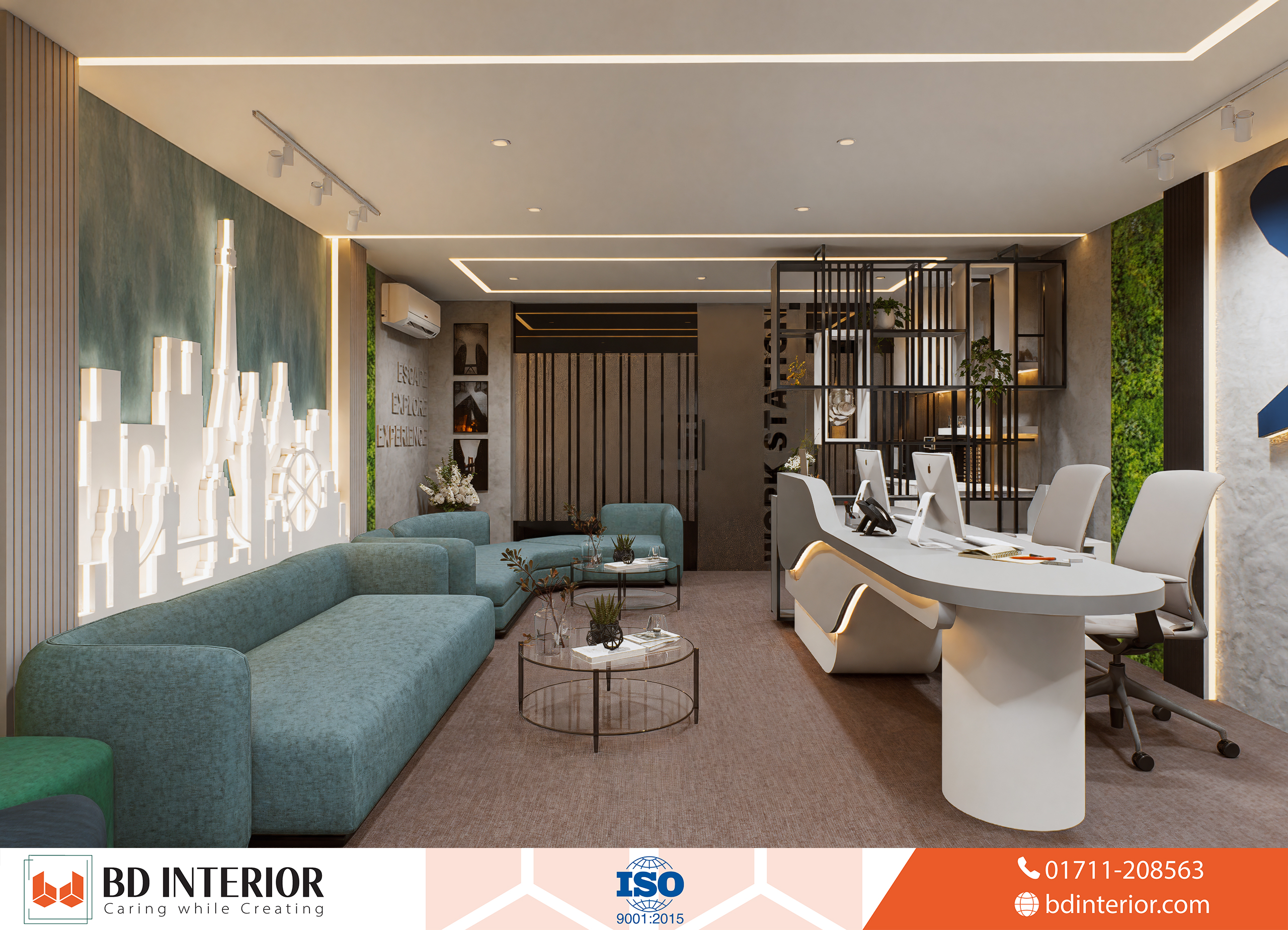 Reception & Waiting Lounge: This is the heart of the client-facing experience. Occupying a generous. This 25” × 15” area is open and inviting. Clients are greeted by a decorative wall featuring the company logo, which establishes a strong brand presence. Instead of a simple counter, we used a flowing, modern desk with plush seating. This area encourages relaxation and makes clients feel valued.