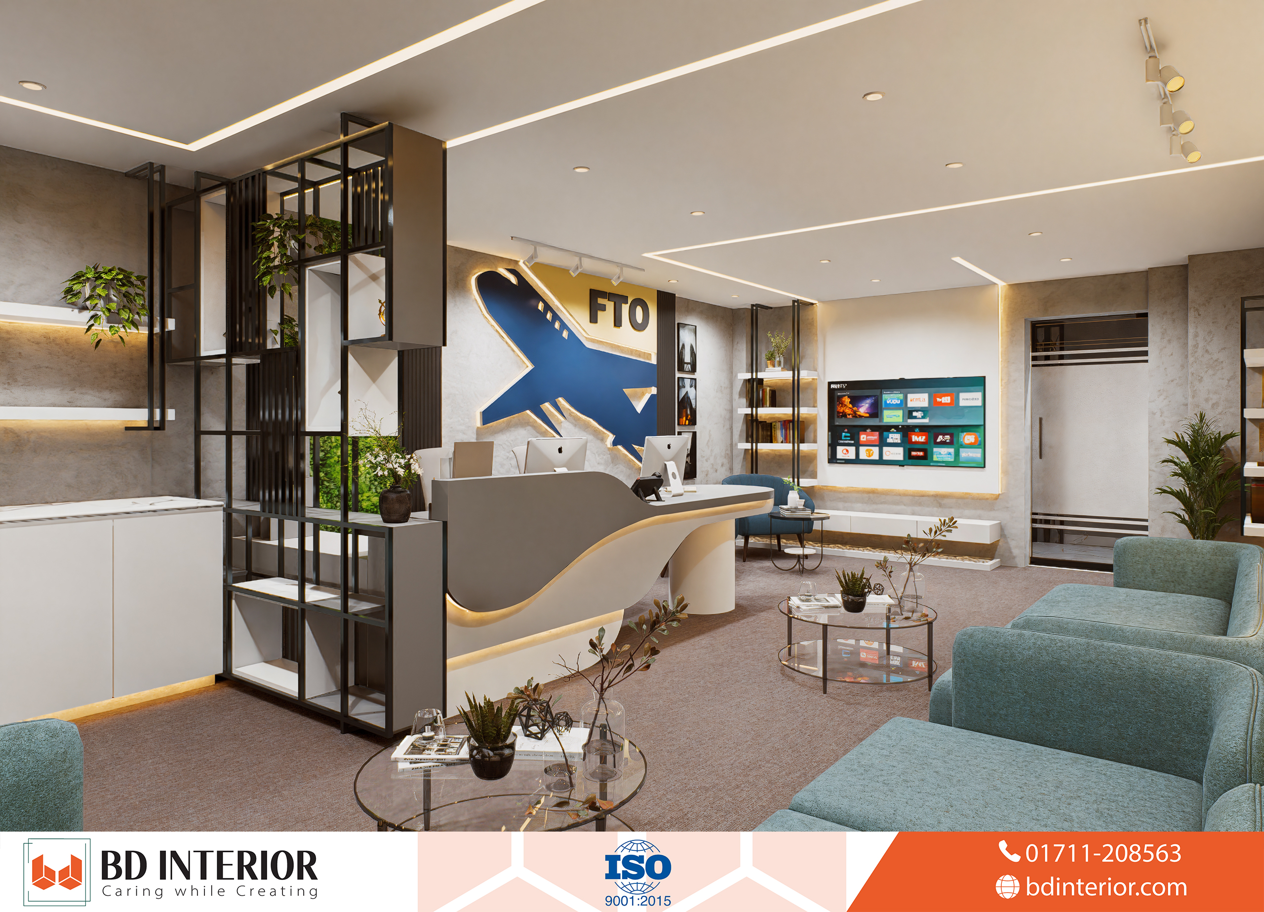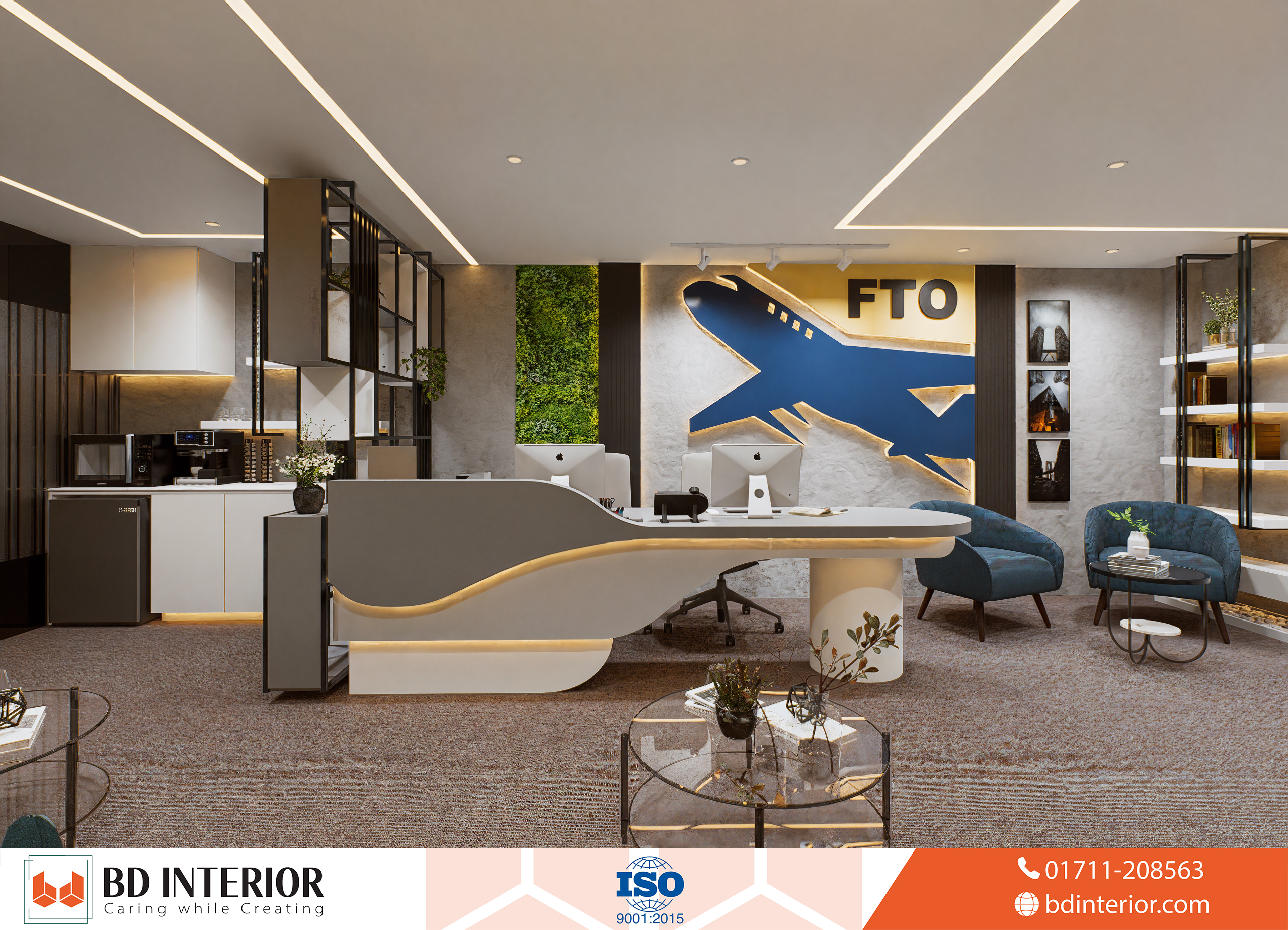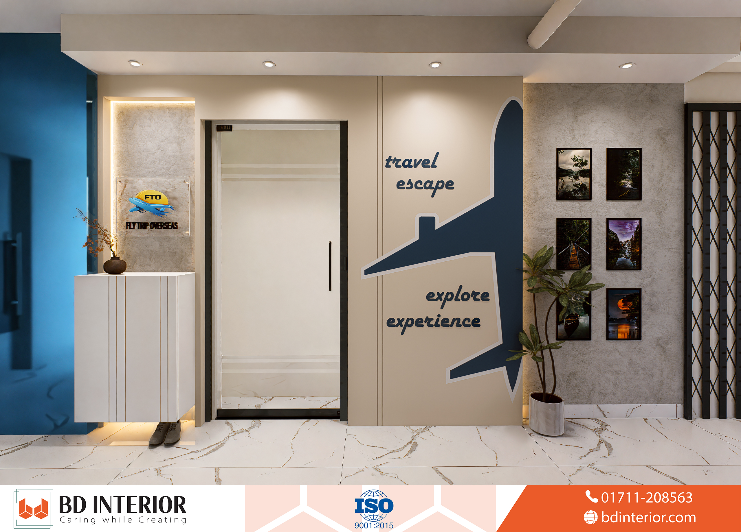 The design blends modern elegance with thematic elements of aviation and global exploration, making sure every part of the office reflects the company’s business identity. For an air-ticketing agent like Fly Trip Overseas, the customer experience begins before they even arrive at the airport. It starts the moment they walk into the office. BD INTERIOR’s design philosophy focused on this idea: creating a physical space that builds confidence, sparks the excitement of travel, and reassures clients about the professional, world-class service they will receive.
