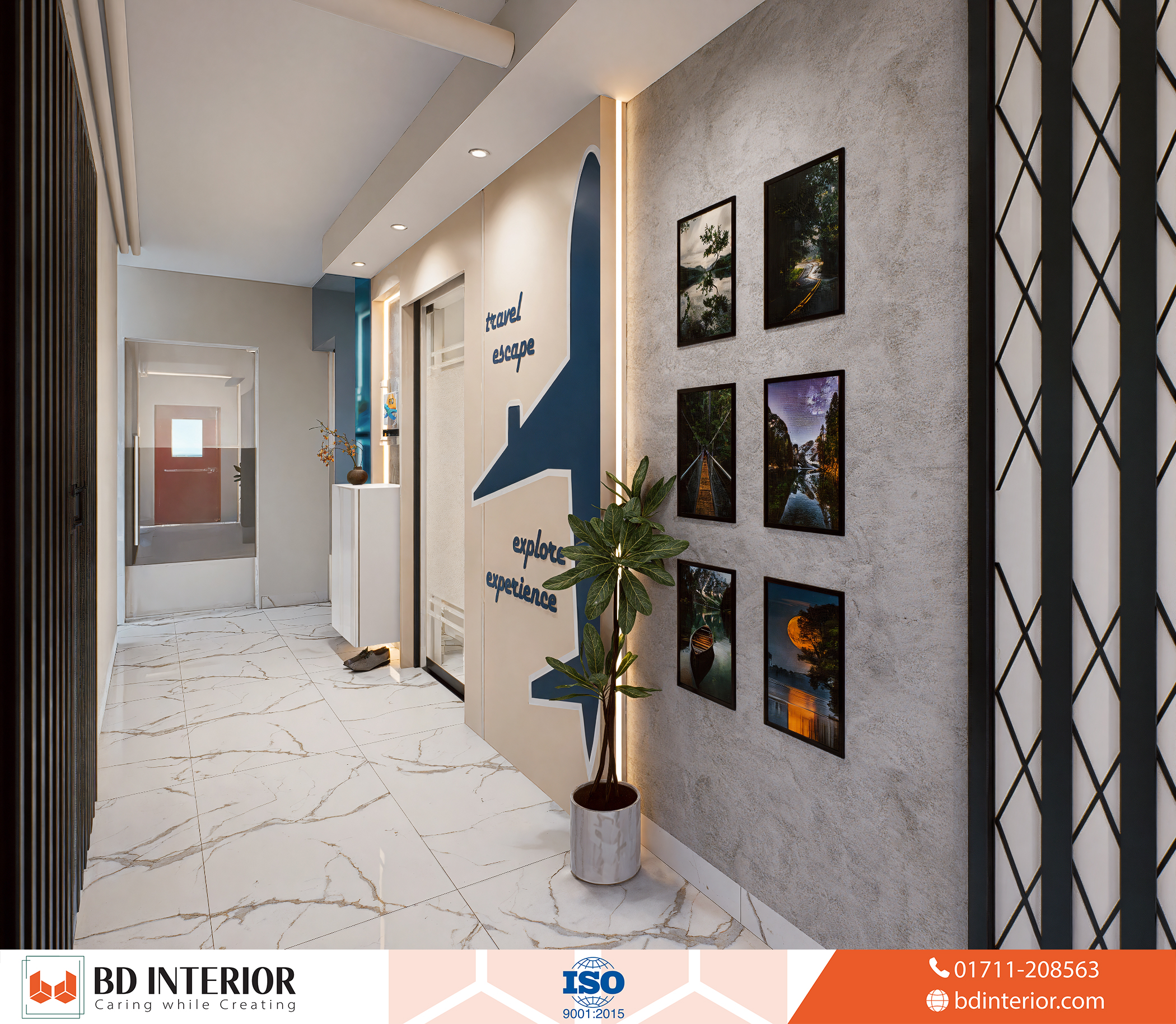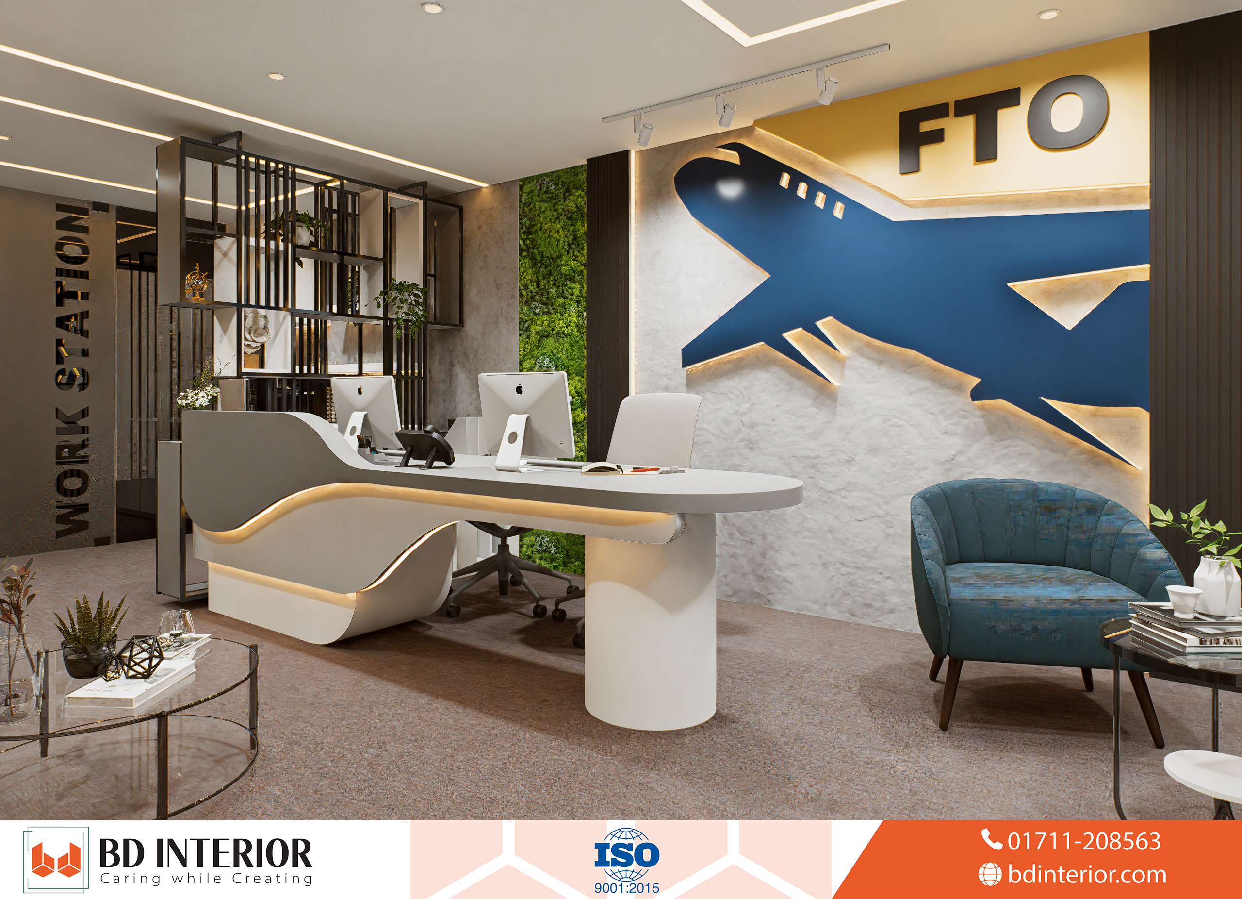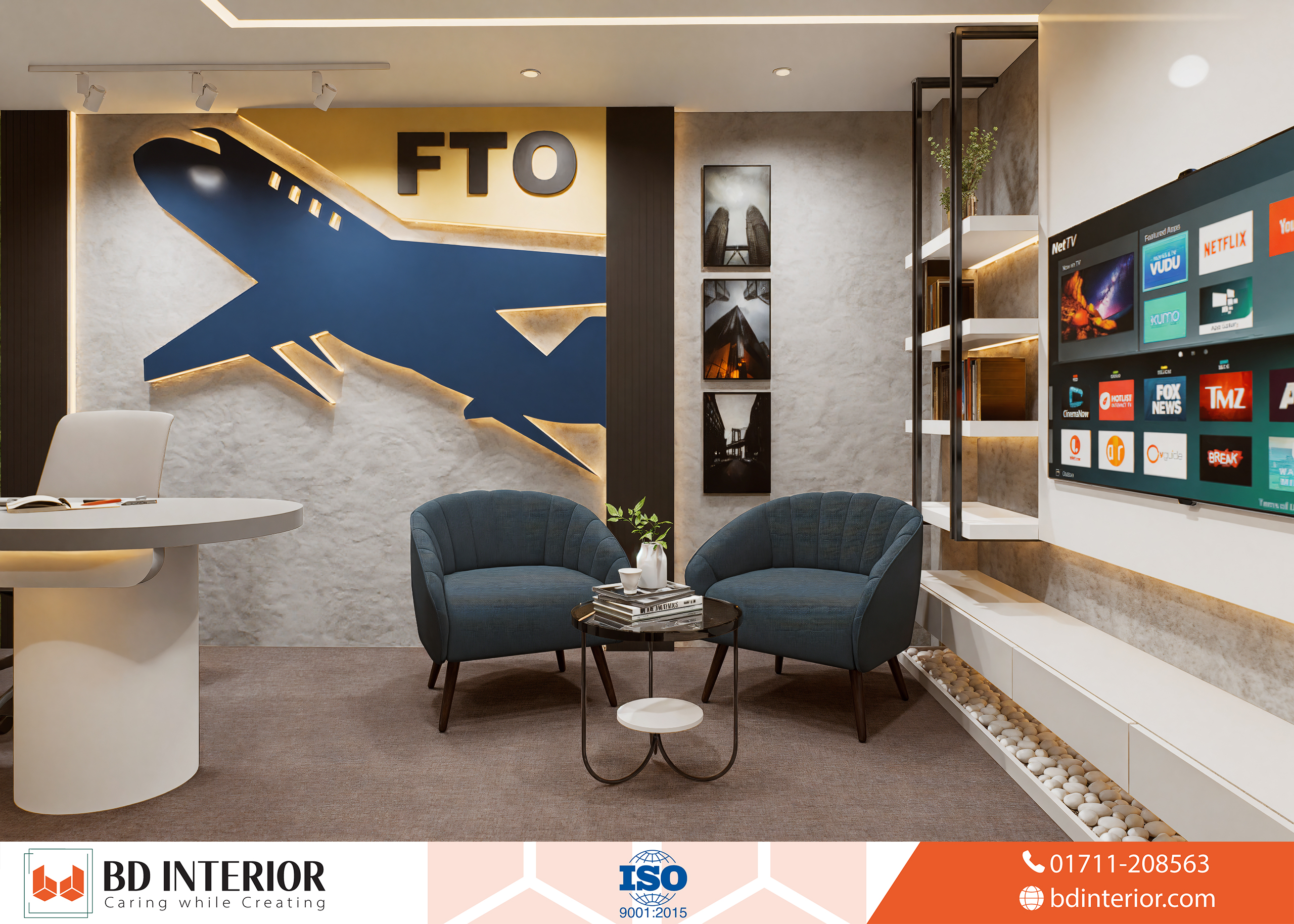 The design blends modern elegance with thematic elements of aviation and global exploration, making sure every part of the office reflects the company’s business identity. For an air-ticketing agent like Fly Trip Overseas, the customer experience begins before they even arrive at the airport. It starts the moment they walk into the office. BD INTERIOR’s design philosophy focused on this idea: creating a physical space that builds confidence, sparks the excitement of travel, and reassures clients about the professional, world-class service they will receive.
