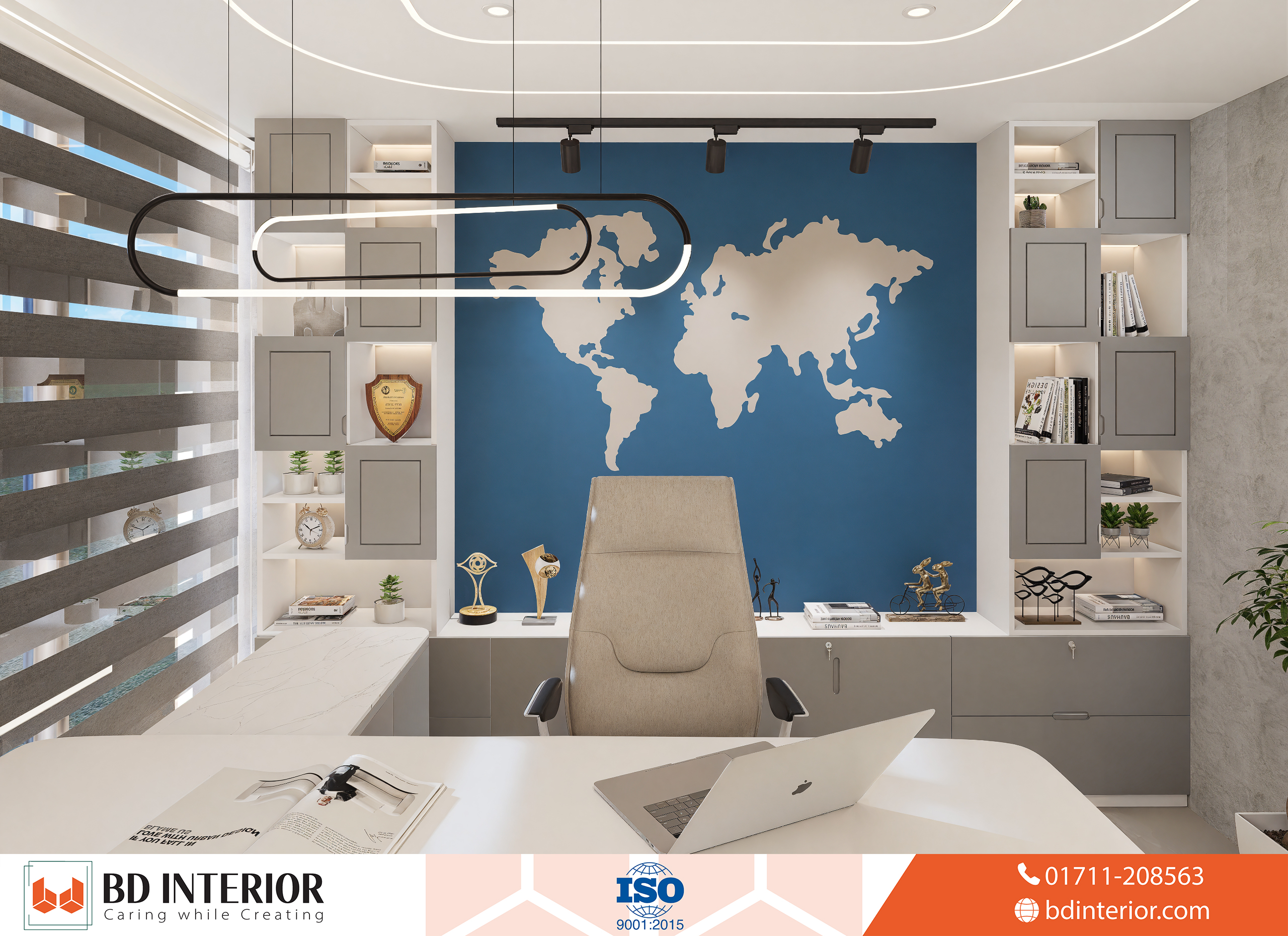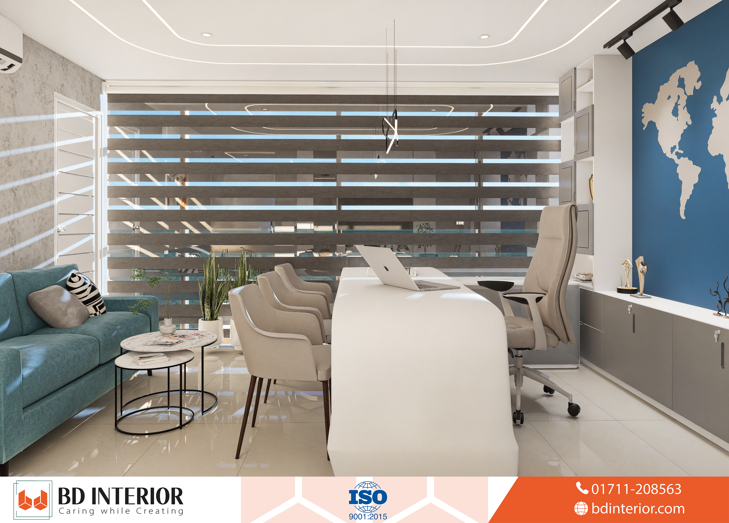 MD’s Room: Positioned in a corner for maximum privacy, the MD’s Room (11 ′′ × 14 ′′) is the executive core. The focal point is a large world map mural behind a tailor-made, pearl-white, sleek executive desk, reinforcing the global nature of the business. The furniture is modern and and comfortable, from the unique desk to the comfortable guest seating area. The space is finished with sophisticated sculptural lighting and ample shelving for displaying accolades, creating an atmosphere of success and authority.