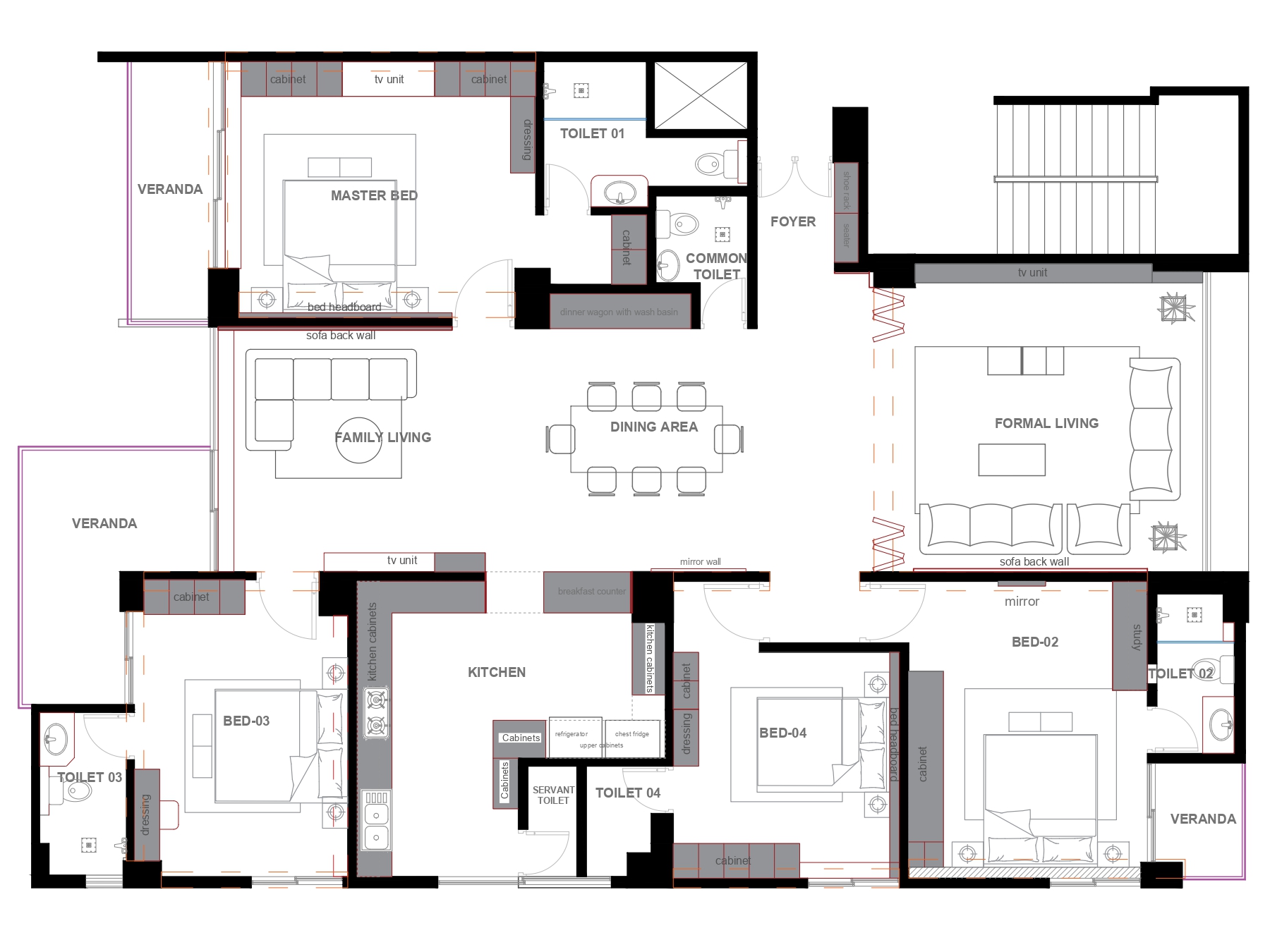Master Bedroom: We designed the master bedroom as a luxurious private sanctuary that provides comprehensive retreat functions for the homeowners. The layout accommodates sleeping, dressing, relaxation, and potential workspace needs through sophisticated spatial planning that creates peaceful environments removed from household activity. The design incorporates premium materials, layered lighting schemes, and carefully curated furnishings that reflect personal taste while ensuring restful atmosphere. We positioned the bedroom to optimize natural light and ventilation while maintaining privacy from other household areas.