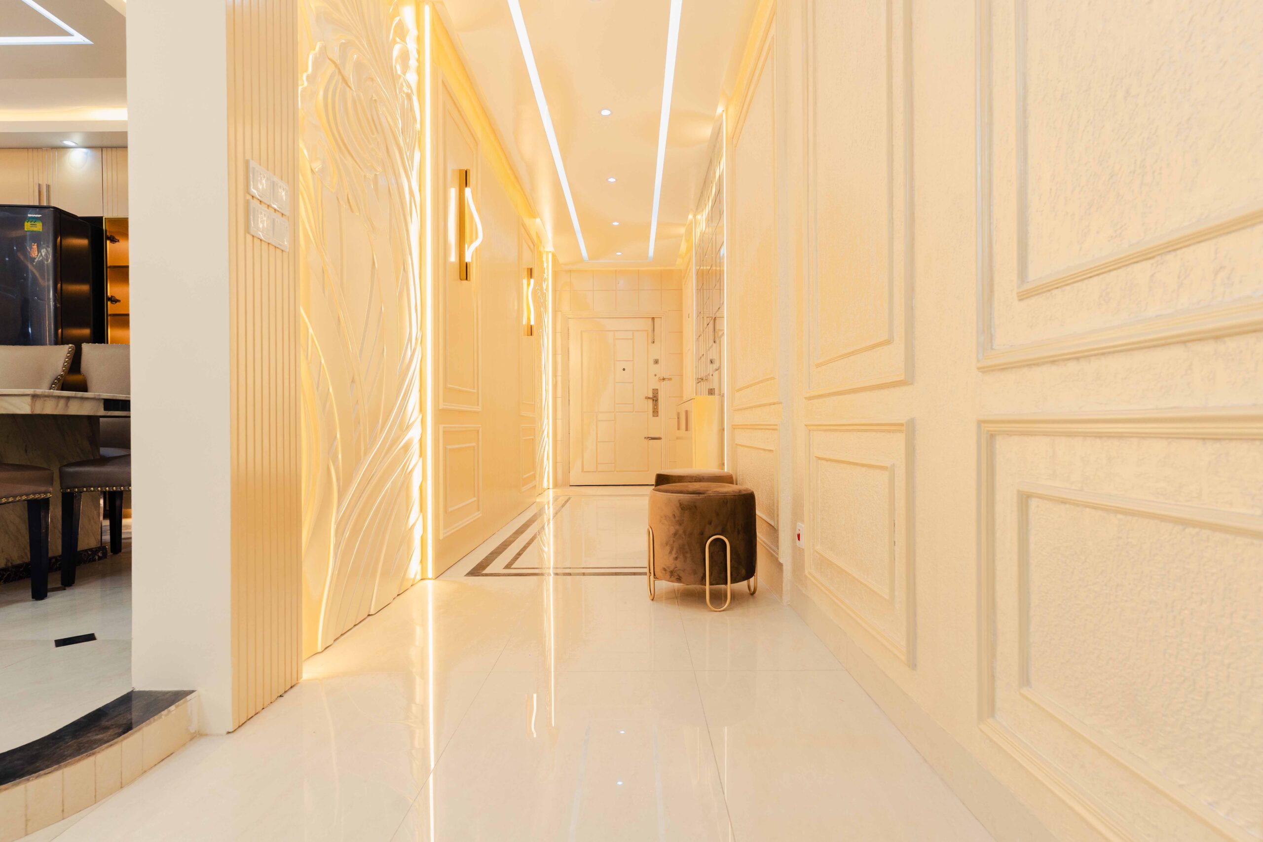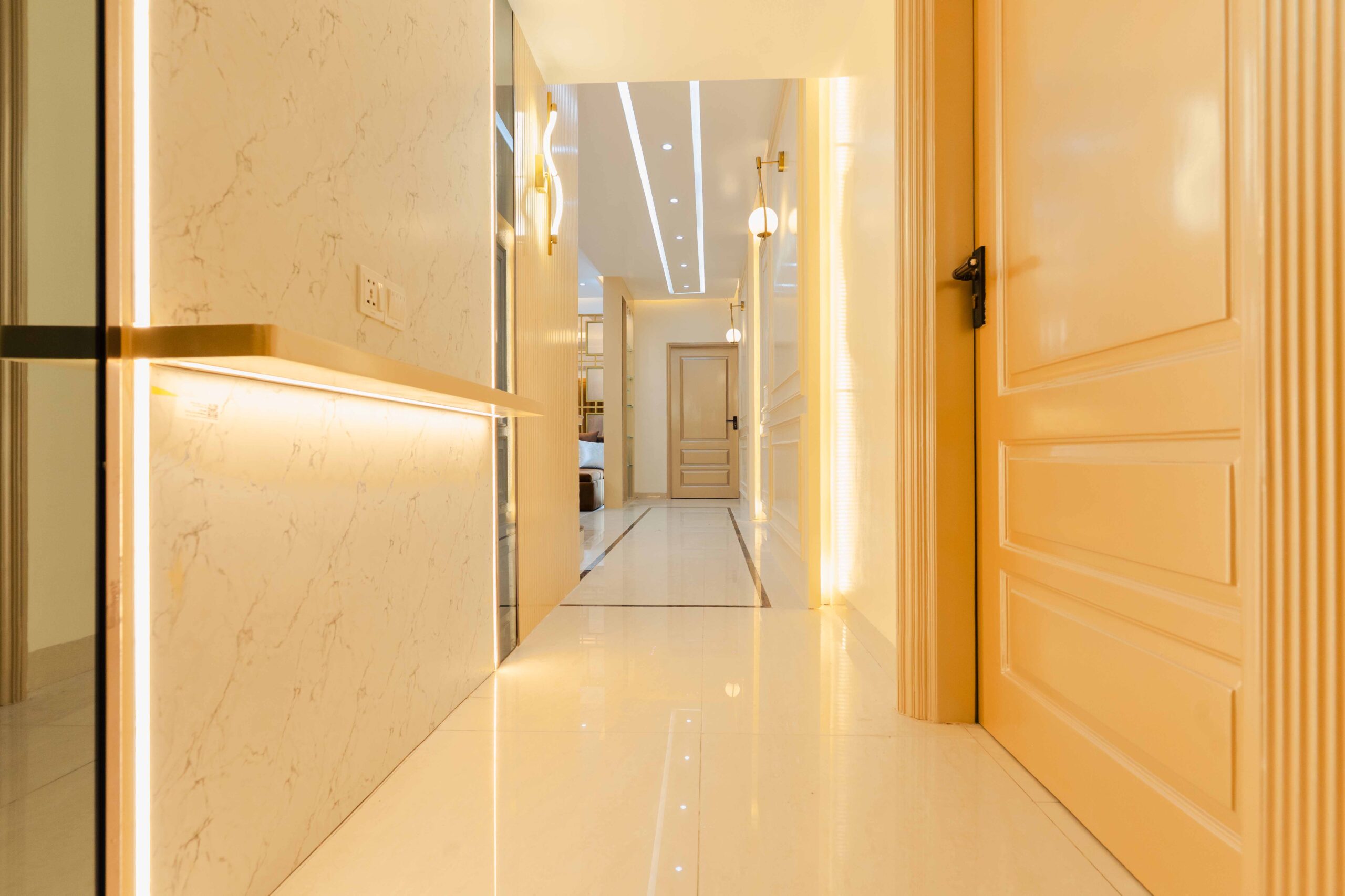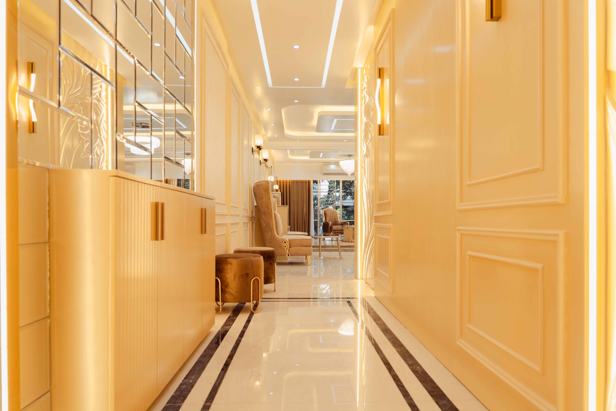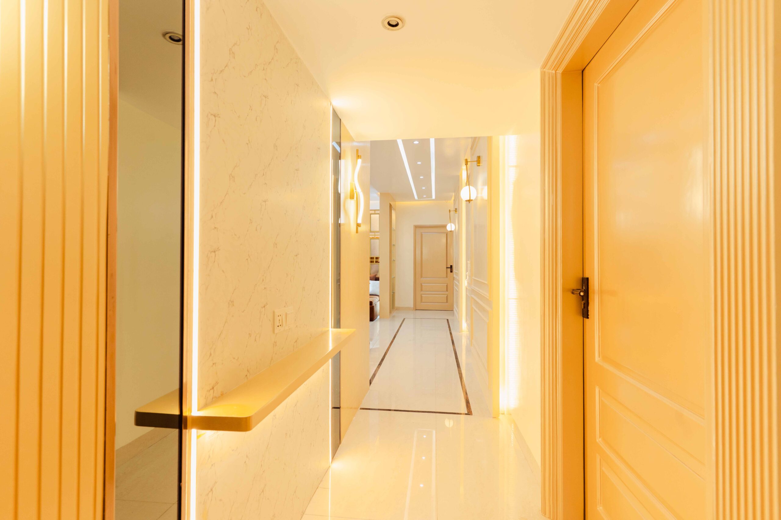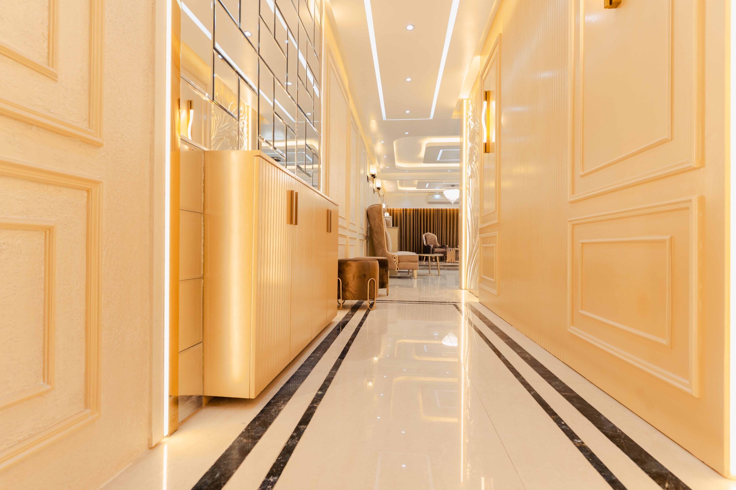 Corridor: The corridor manages traffic flow while maintaining aesthetic continuity, demonstrating attention to transition and wayfinding through the thoughtful use of materials and lighting.