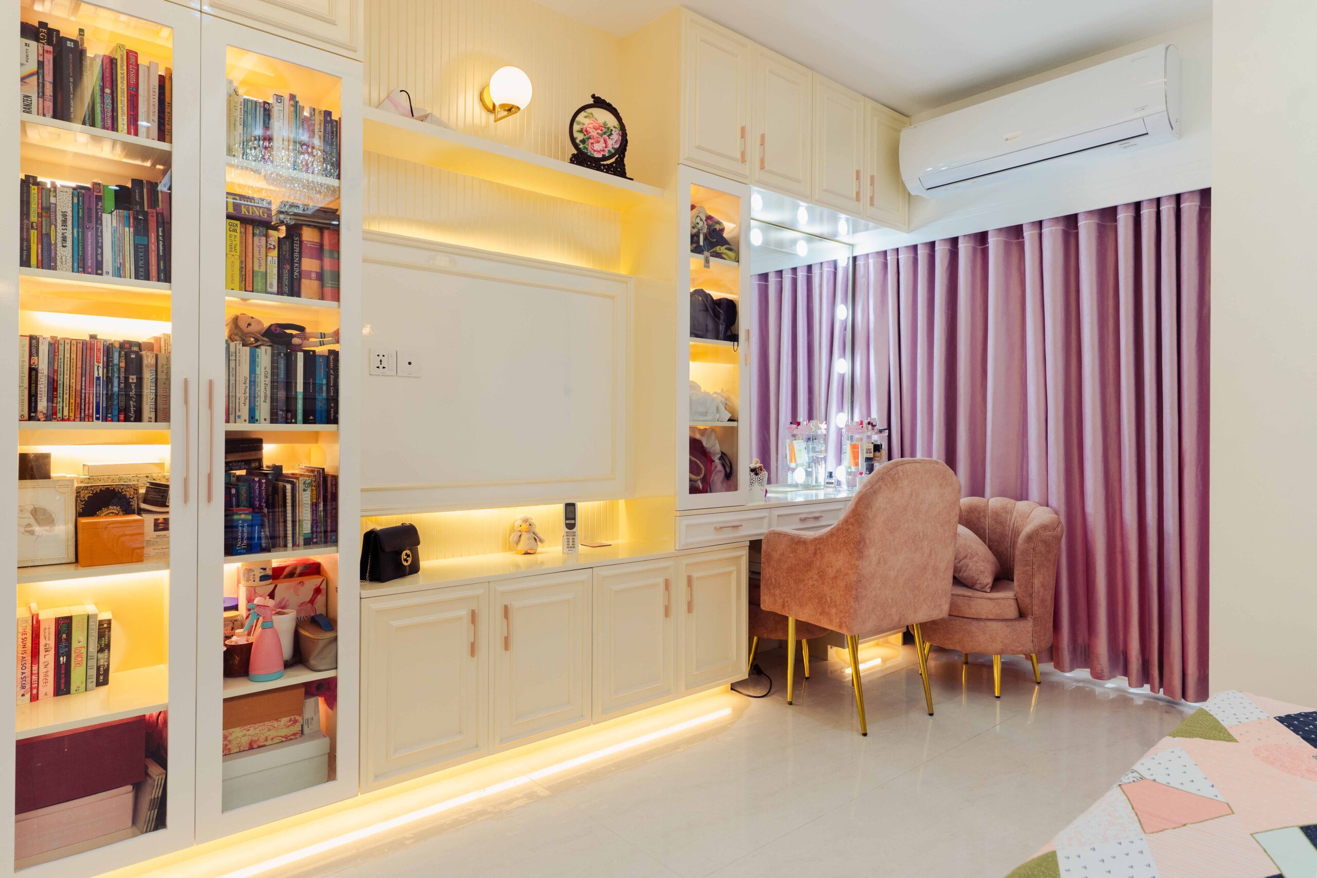 Girl’s Bedroom: The bedroom is designed to accommodate specific needs, featuring a dedicated verandah with access to added outdoor space. The design balances study, storage, and sleeping areas, incorporating natural light and offering semi-private relaxation opportunities.