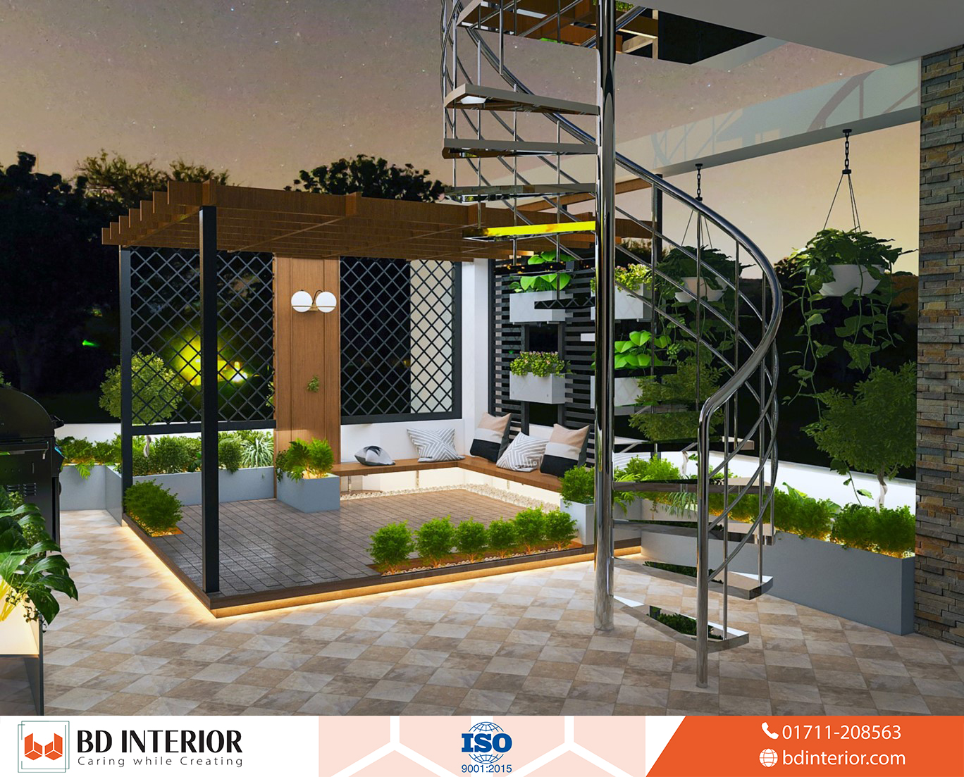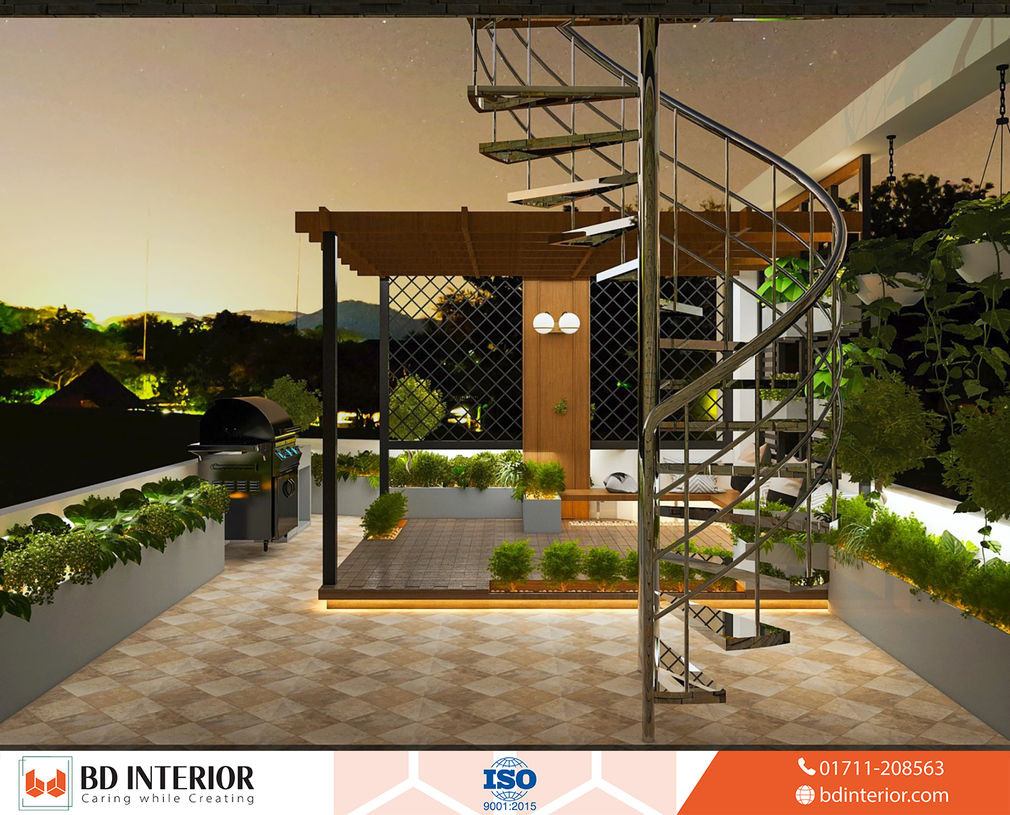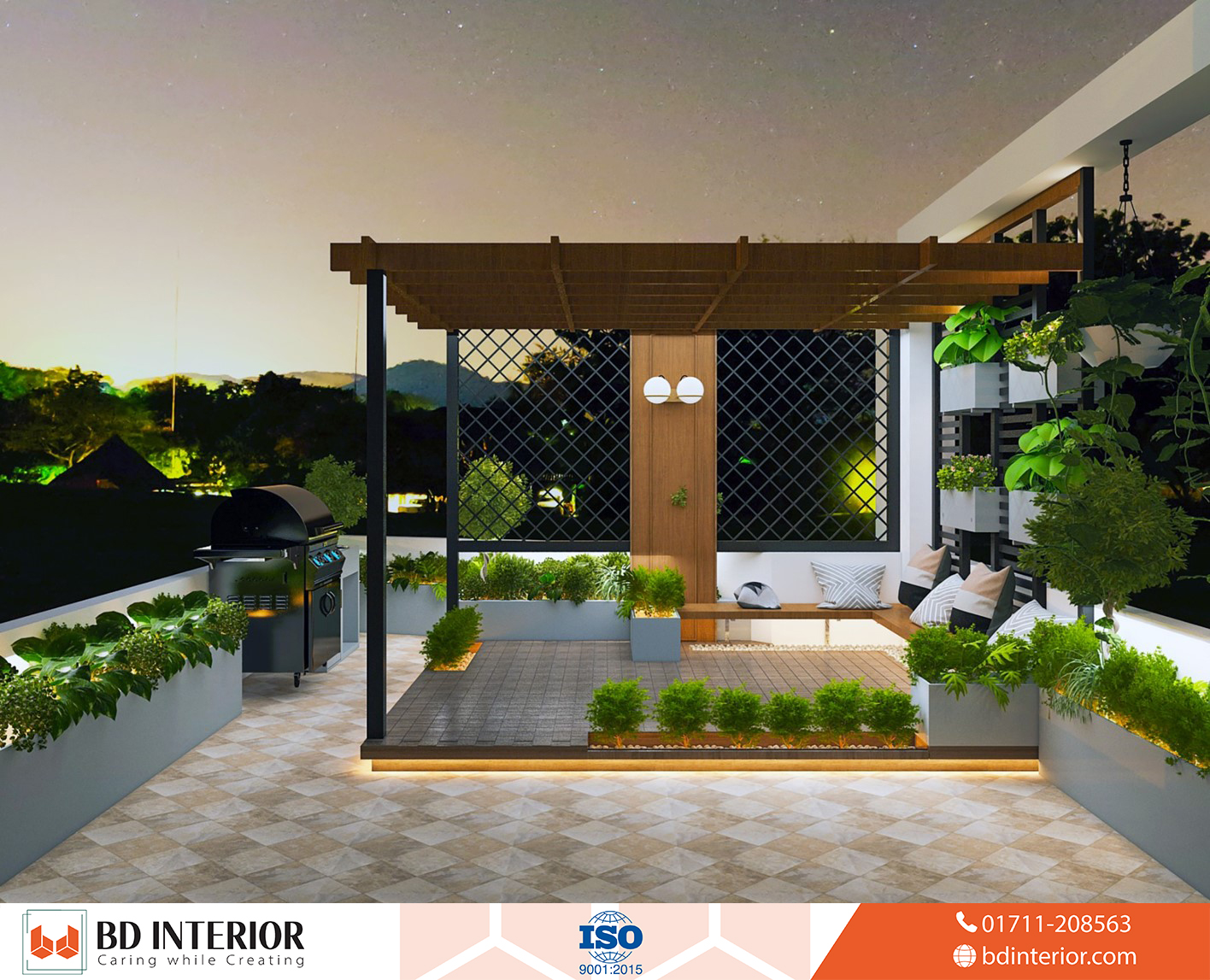 Night Roof Garden: The evening garden design transforms the rooftop into an enchanting after-dark entertainment space through strategic lighting systems and atmospheric design elements. We incorporated illumination that highlights landscape features while creating comfortable evening environments for dining, relaxation, and social gatherings. The night design ensures the rooftop remains functional and beautiful throughout extended daily use while providing safe navigation and security lighting essential for rooftop spaces.
